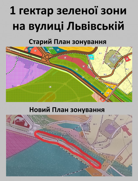 – Цілий гектар зеленої зони “P-3” (Рекреаційна зона озеленених територій загального користування призначається для повсякденного відпочинку населення і включає парки, сквери, сади, бульвари, міські ліси, водойми, пляжі, лугопарки, лісопарки, гідропарки, меморіальні та інші спеціалізовані парки), де на даний момент фактично росте повноцінний ліс дорослих дерев, замінено на «Г-6» (зони розміщення об’єктів торгівлі). Відтепер вона призначаються для розташування магазинів, торговельних комплексів, ринків та ринкових комплексів. Зону формують території громадської забудови, на яких за містобудівною документацією розміщуються торговельні заклади та інші об’єкти обслуговування населення.