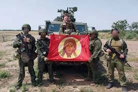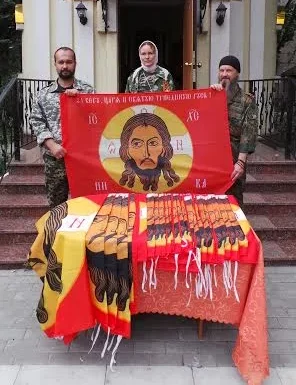 Ми точно ще не в окупації?І не розказуйте мені про ікони Ісуса Христа! Це не ікона, не навіть не хоругва! Це звичайний прапор бойовиків “ДНР”, який освячували московські попи для гіркіна-стрілкова, перед яким присягав на вірність росії захарченко і під яким воюють ті, хто вбиває українців!Це прапор “рускава праваславнава фашизма”, під яким росіяни ідуть в бій!