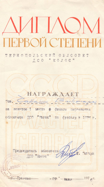 Диплом Віктора Чабана за зайняте перше місце у фіналі першості облради ДСТ «Колос» по футболу 1976 р.