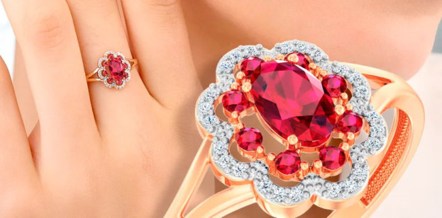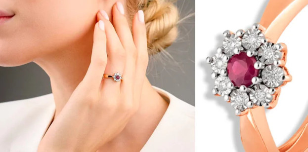 - модели с бриллиантовым ореолом вокруг центрального рубина, напоминающим изящный драгоценный цветок;