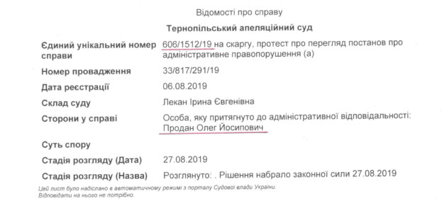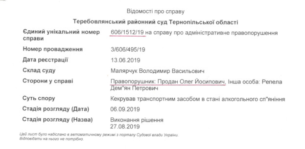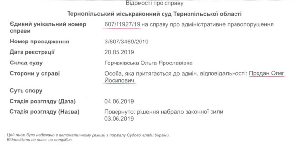 Теребовлянський районний суд за даним фактом відкрив справу про адміністративне правопорушення №606/1512/19. Однак чиновник на засідання не з’являвся, всіляко затягуючи розгляд, щоби закінчився термін притягнення до відповідальності.