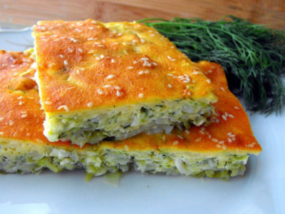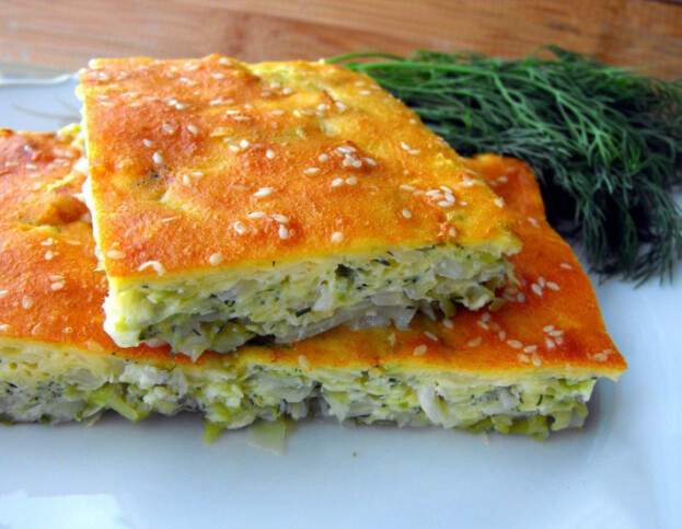Капусту нашаткувати, підсолити і злегка зім’яти. Додати дрібно нарізану зелень. Яйця збити в однорідну масу. Додати інші інгредієнти і замісити тісто. Форму змастити вершковим маслом і викласти на неї капусту. Залити тістом і посипати зверху кунжутом. Поставити форму в розігріту до 180 ° С духовку, випікати 30 хвилин до утворення золотистої скоринки.