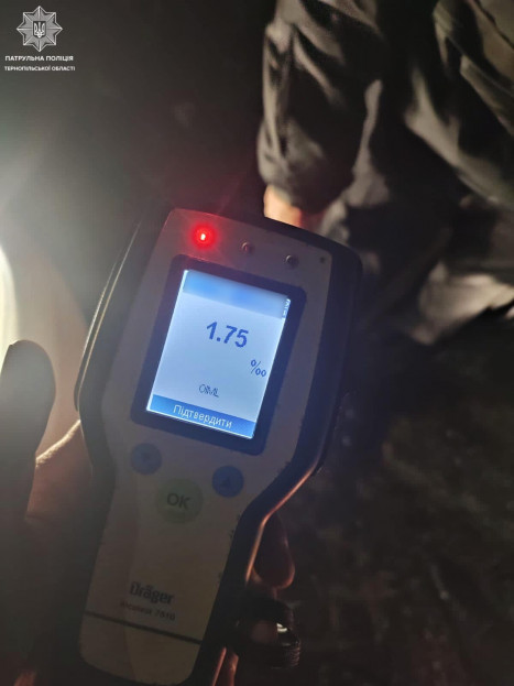Як повідомляє патрульна поліція Тернопільської області, спілкуючись з керманичем, поліцейські помітили в нього ознаки алкогольного сп’яніння. Водій погодився пройти огляд на визначення стану сп’яніння за допомогою приладу Драгер на місці. Результат — 1,75 проміле алкоголю в крові чоловіка, що перевищує допустиму норму.