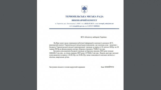 Нагадаємо, Комітет виборців України проаналізував витрати найбільших міст України на допомогу ЗСУ. Інформацію було отримано від 26 міських рад у відповідь на інформаційні запити. Серед тих міст, які виділили найменше — Івано-Франківськ та наш Тернопіль, повідомив аналітик КВУ Денис Рибачок.