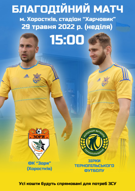 У неділю, 29 травня, Координаційний центр підтримки Збройних Сил України Асоціації футболу Тернопільщини організовує черговий з серії благодійних матчів команди зірок тернопільського футболу. Цього разу наші зірки проведуть поєдинок з титулованою хоростківською «Зорею».