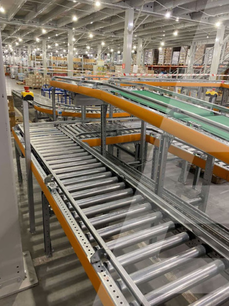 - Роликові транспортери. Ці конвеєри також використовуються для транспортування товарів між зонами складу. Існують приводні та неприводні моделі конвеєрів (відрізняються наявністю двигунів). Роликові транспортери часто доповнюють стрічкові, але при цьому можуть переміщати вантажі тільки горизонтально.