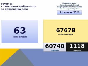 63 нових випадки коронавірусної хвороби COVID-19 зафіксовано в Тернопільській області станом на 11 травня 2021 року.