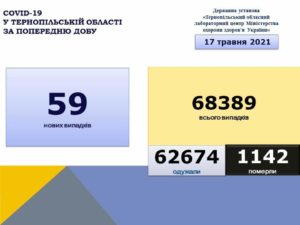 59 нових випадків коронавірусної хвороби COVID-19 зафіксовано в Тернопільській області станом на 17 травня 2021 року.