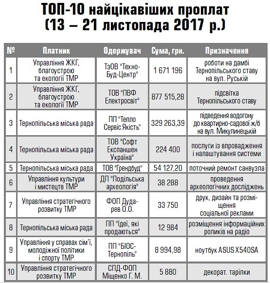 • Пенсіонер зі Львова позичив власне авто незнайомцю, та повертати власність довелося гусятинським поліцейським • Від Лановецької міськради вимагають відшкодувати 1,8 млн грн • На Бережанщині пішохід потрапив під колеса Audi A6 • Останній бій прийняв на Донеччині: підтверджено загибель воїна з Гусятинщини • На Теребовлянщині під колесами авто загинув 65-річний чоловік • У центрі Тернополя сталася масова бійка молодиків (відео) • У Тернополі син до смерті забив рідну матір • Співак з Тернопільщини відреагував на заміжжя ексдружини, з якою він прожив у шлюбі понад 20 років • У лікарні швидкої допомоги у Тернополі запрацював Центр ментального здоров’я • Військовий з Тернопільщини загинув через місяць після мобілізації • Футзальний чемпіон Тернопільщини дозаявив чемпіона України • Як вибрати гербіцид на соняшник під технологію вирощування: класична, Sumo, Clearfield • Воїн з Тернопільщини прийняв свій останній бій у Луганській області • На Тернопільщині оприлюднили графік вимкнення світла на 5 грудня • Від слідчого до командира мінометного розрахунку: історія тернопільського поліцейського Володимира Кузьо • На Теребовлянщині ув’язнили батька, який розбещував малолітню доньку • На Лановеччині п’яний студент на батьківському авто збив багатодітну матір • На Гусятинщині вантажівка збила пішохода: численні травми та переломи • Трагедія у Великій Березовиці: в пожежі загинула жінка • Інтимна пластика без табу: як жінки повертають комфорт і контроль над власним тілом • Вважався зниклим безвісти: на Донеччині загинув військовий з Тернополя • На Гусятинщині водій намагався підкупити поліцейських • І знову винна клінінгова компанія: чому жінки відмовляються бути домогосподарками • Міську раду Кременця зобов’язали охороняти Єврейське кладовище • Тернопільміськгаз готують до банкрутства через кримінал і махінації з коштами