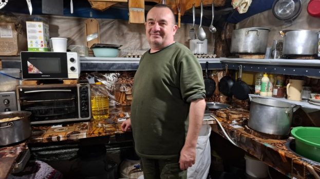 Олег, який до війни мав ресторанний бізнес і кейтеринг, варить макарони, смажить рибу та готує суп із фрикадельками.