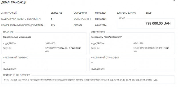 Оплата за цю послугу пройшла 5 червня. Виконавцем робіт є консорціум “ЗемАрхКонсалт”, який зареєстрований у Львові зі статутним фондом всього 10 тисяч гривень.