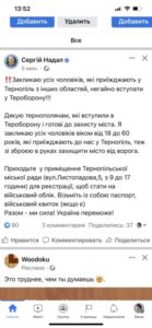 !!!Закликаю усіх чоловіків, які приїжджають у Тернопіль з інших областей, негайно вступати у Тероборону!!!, повідомляє мер міста Сергій Надал.