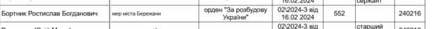 Що цікаво, саме профспілка Кабінету міністрів минулоріч нагородила міського голову Бережан Ростислава Бортника орденом «За розбудову України». Інформація про це розміщення на сайті установи, а відповідний запис зроблено 16.02 2024 року.
