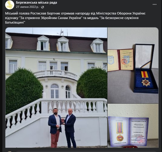 Ще раніше, влітку 2022 року Бережанська міська рада розмістила інформацію про те, що «Міський голова Ростислав Бортник отримав нагороду від Міністерства Оборони України: відзнаку “За сприяння Збройним Силам України” та медаль “За безкорисне служіння Батьківщині”.
