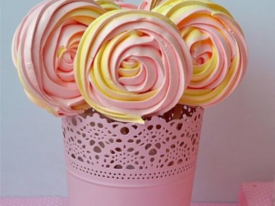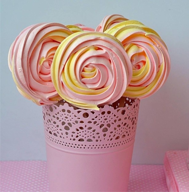 На пергамент розмістити меренги, вставити палички і сушити у відкритій (це важливо! Шпарина – на сірникову коробку) духовці при найменшій температурі від 4 до 6 годин.