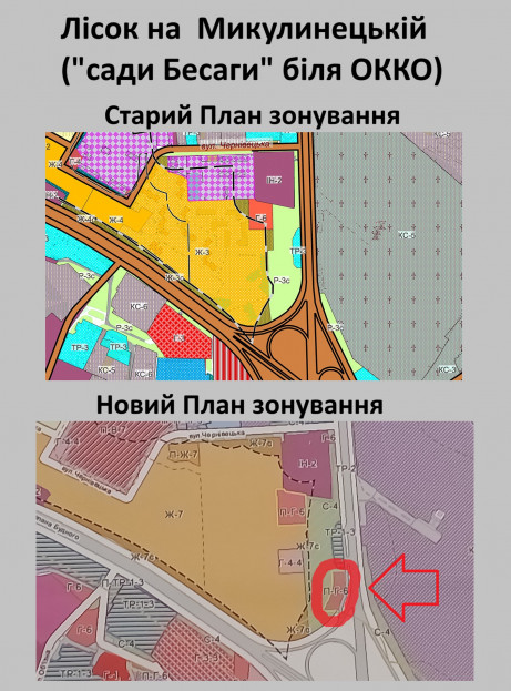 Територію площею понад 2500 кв. м поблизу заправки «ОККО» навпроти Микулинецького кладовища, де росте повноцінний ліс, змінено із зони «Р-3с» (зелені насадження для забезпечення правових умов створення і збереження спеціальних зелених насаджень як фактору захисту навколишнього природного середовища від негативного антропогенного впливу) на зону «Г-6» (розміщення об’єктів торгівлі. Призначаються для розташування магазинів, торговельних комплексів, ринків та ринкових комплексів).