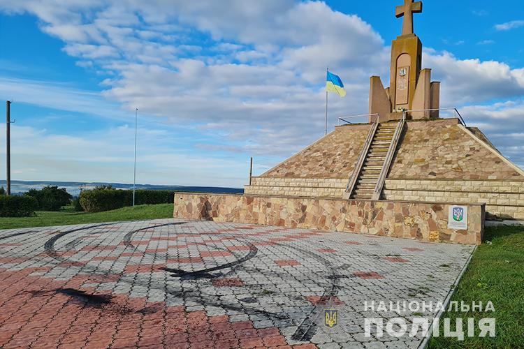 На місце події виїхали працівники групи швидкого реагування патрульної поліції. На бруківці поблизу меморіалу вони виявили брудні сліди від протекторів шин невідомого транспортного засобу.