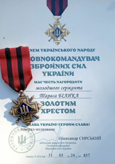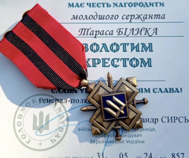 Жителя Саранчуківської громади, що на Бережанщині, військовослужбовця Збройних Сил України Тараса Білика, нагороджено почесним нагрудним знаком головнокомандувача ЗСУ “Золотий Хрест».
