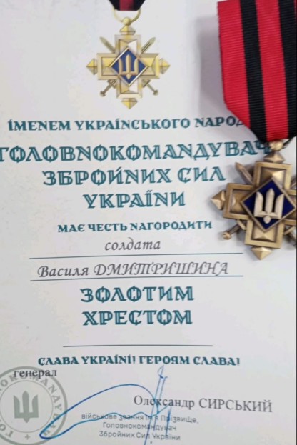 Високою державною нагородою «Золотим хрестом» Головнокомандувач ЗСУ Олександр Сирський відзначив воїна з Білецької громади, жителя села Ігровиця – воїна Василя Дмитришина. Про це повідомляє Тернопільського обласного ТЦК та СП.
