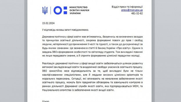 В інформаційному запиті кореспонденти Суспільного надіслали Міністерству освіти і науки України низку запитань. Чи відомо МОН про сексистський скандал у Тернопільському національному педагогічному університеті ім. В.Гнатюка, де під час лекцій колишній ректор, професор Володимир Кравець поширював сексистські наративи? Чи зверталися до МОН щодо цієї ситуації та хто? Які дії Міністерства освіти і науки будуть зроблені чи вже зроблені, аби вирішити ситуацію? Чи затверджувало Міністерство освіти і науки програму курсу “Педагогіка: підготовка молоді до сімейного життя” та чи ознайомлювалося зі змістом лекцій?