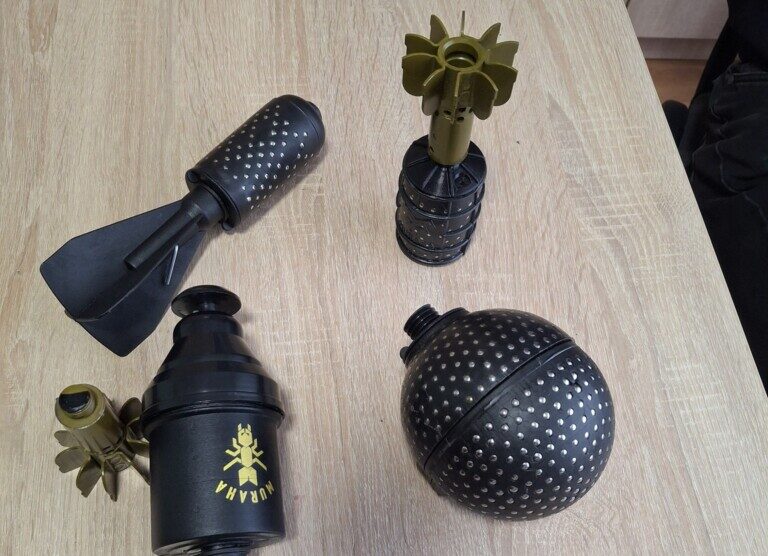 Серед переданих експонатів — елементи різної форми та конструкції, зокрема подовжені та округлі деталі з хвостовими стабілізаторами, а також корпуси з характерною текстурою та металевими елементами.