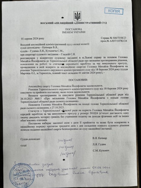 У четвер, 1 серпня, Восьмий апеляційний адміністративний суд Львова задовольнив позов Михайла Головка про поновлення на посаді голови Тернопільської облради та виплату 591 тис. грн зарплати за час вимушеного прогулу.