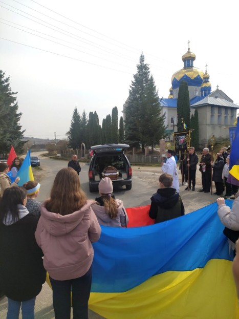 Жителі Гусятинської громади «живим коридором» зустріли траурний кортеж із тілом полеглого, на колінах та зі сльозами на очах, опісля кортеж вирушив до рідного дому воїна у с. Городниця.