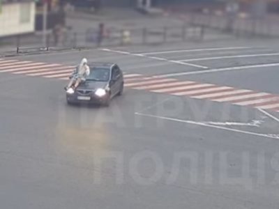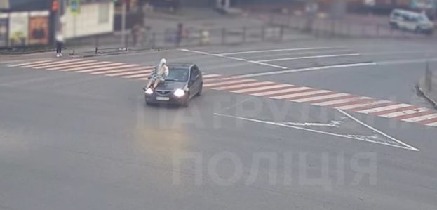 Тернопіль. Містом їде авто “Dacia”, а на капоті сидить людина. Це не зйомки фільму, а реальне життя у Файному місті. Відповідне відео опублікувала патрульна поліція Тернопільської області.
