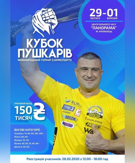 Міжнародний турнір з армспорту «Кубок Пушкарів» відбудеться у Кременці 29 лютого – 1 березня.