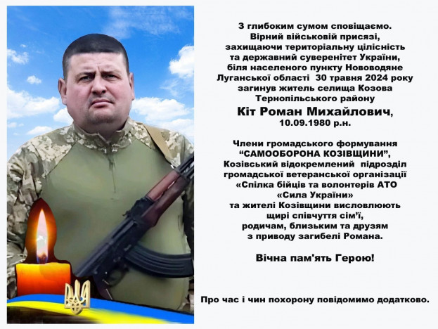І знову гірка звістка надійшла для Козівської громади… 30 травня біля населеного пункту Нововодяне Луганської області від вражої руки загинув  молодший сержант Роман Михайлович Кіт (10.09.1980 року народження).