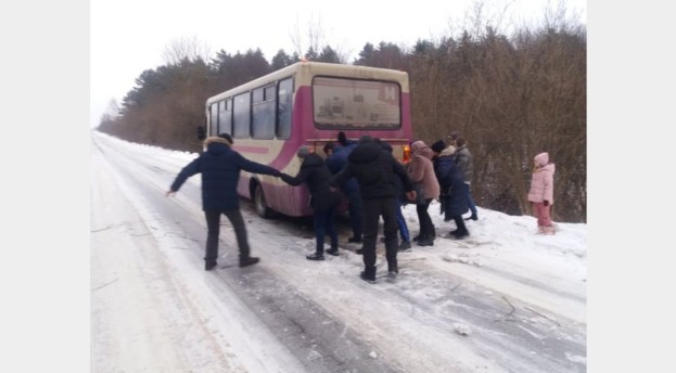 Люди не стали чекати підмоги — вийшли надвір і спробували штовхати автобус. На ковзкій дорозі — це була марна справа: «Еталон» крутив колесами — і стояв на місці.