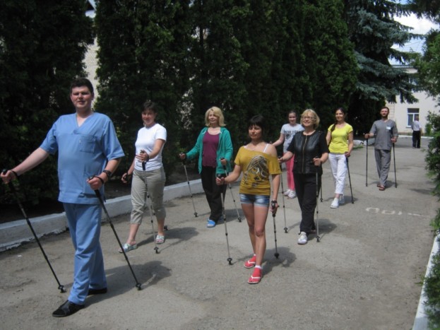 Лікуючий лікар кожного відділення лікарні, а їх є тут вісім, назначає пацієнтам дану процедуру, виходячи із загального стану їхнього здоров’я, і вже спеціально підготовлені інструктори в залі ЛФК, зокрема Олег Дудук, вчать групу цій ходьбі. Та перед тим виконують підготовчі тренувальні вправи, відбувається розминка. Другий і третій етапи заняття – це ходьба по пересічній місцевості (на території лікарні на доріжках зроблено розмітки) і релаксація.