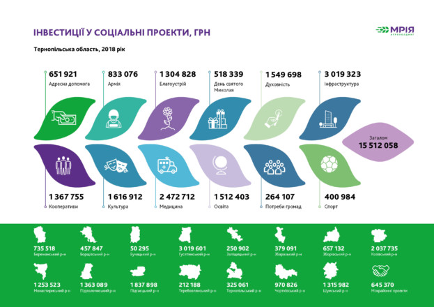 На покращення інфраструктури краю «Мрія» виділила 3 млн. грн., ще 1,3 млн. – на проекти з благоустрою, а 1,5 млн. – на освітні потреби. Культура і спорт області отримали фінансову підтримку розміром понад 2 млн. грн., які були спрямовані, зокрема, на відновлення місцевих будинків культури і підтримку спортивних команд. А пілотним проектом, реалізованим агрохолдингом на території  Тернопільщини у 2018 році, стало корпоративне волонтерство: понад 200 співробітників компанії провели масштабну толоку в Гусятині, де навели благоустрій на території місцевого стадіону і спортивно-відпочинкового комплексу.