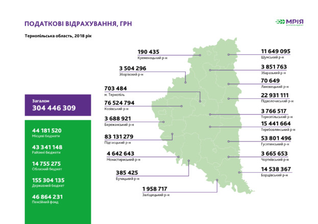 «Мрія Агрохолдинг» вкотре підтвердив свій статус сумлінного платника податків і надійного партнера місцевих громад, оприлюднивши звіт про виконані у 2018 році податкові та соціальні зобов’язання. Зокрема, підприємства холдингу, розташовані у Тернопільській області, за минулий рік сплатили 304,4 млн. грн. податків, що на 29,2 млн. грн. більше, ніж у 2017-му. Зросла також сума соціальних інвестицій, здійснених «Мрією» на Тернопільщині: за 2018 рік на потреби громад компанія виділила 15,5 млн. грн., що на 3,2 млн. грн. перевищує аналогічну суму, виділену роком раніше.
