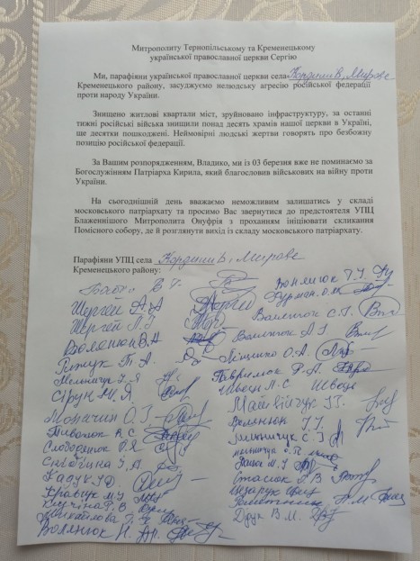 – Ми, парафіяни Української православної церкви сіл Кордишів та Мирового засуджуємо нелюдську агресію російської федерації проти народу України. Знищено житлові квартали міст, зруйновано інфраструктуру, за останні тижні російські війська знищили понад десять храмів нашої церкви в Україні, ще десятки пошкоджені. На сьогоднішній день вважаємо неможливим залишатися у складі московського патріархату та просимо Вас звернутися до предстоятеля УПЦ Блаженнішого Митрополита Онуфрія з проханням ініціювати скликання Помісного собору, де й розглянути вихід із складу московського патріархату, – йдеться у зверненні парафіян УПЦ сіл Кордишів та Мирове до Митрополита Тернопільського та Кременецького УПЦ Сергія (всього 31 підпис).