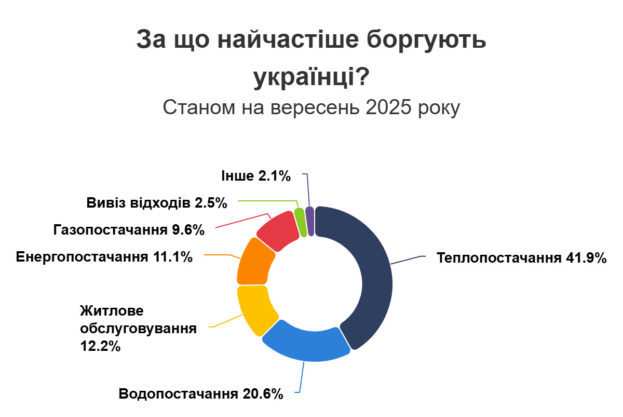 Левова частка заборгованостей стосується теплопостачання — 330 236 випадків (42%). Наслідують борги за воду — 162 455 (21%) та житлове обслуговування — 96 265 (12%). Також значні борги є за енергопостачання (87 708) та газ (75 522).