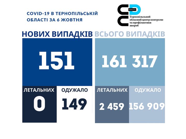 151 новий випадок коронавірусної хвороби COVID-19 зафіксовано в Тернопільській області за 6 жовтня 2022 року. Про це повідомляє Державна установа «Тернопільський ОЦКПХ МОЗ України».
