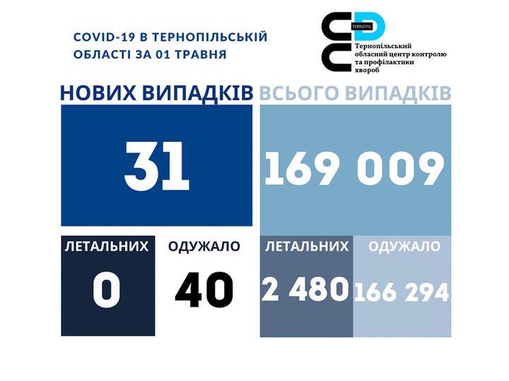 31 новий випадок коронавірусної хвороби COVID-19 зафіксовано в Тернопільській області за 1 травня 2023 року. Про це повідомляє Державна установа «Тернопільський ОЦКПХ МОЗ України».