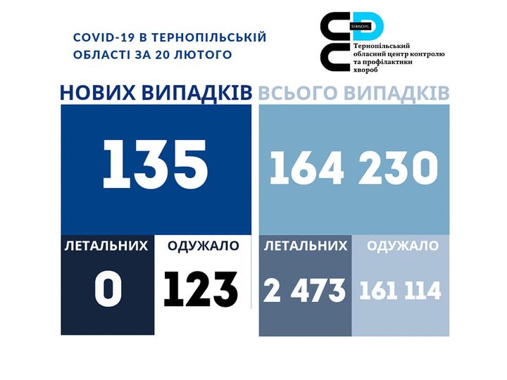135 нових випадків коронавірусної хвороби COVID-19 зафіксовано в Тернопільській області за 20 лютого 2023 року. Про це повідомляє Державна установа «Тернопільський ОЦКПХ МОЗ України».
