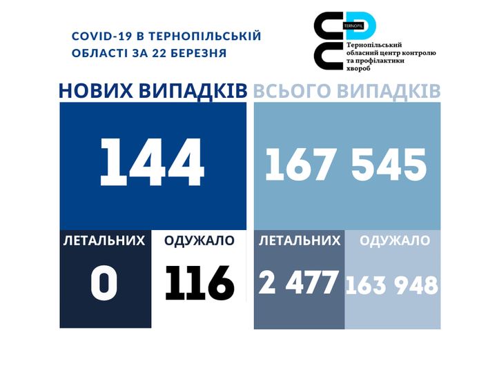 144 нових випадки коронавірусної хвороби COVID-19 зафіксовано в Тернопільській області за 22 березня 2023 року. Про це повідомляє Державна установа «Тернопільський ОЦКПХ МОЗ України».
