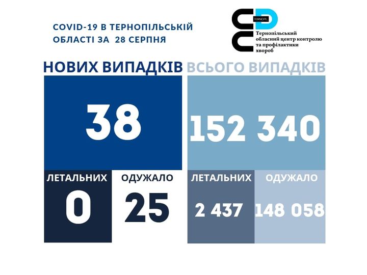 38 нових випадків коронавірусної хвороби COVID-19 зафіксовано в Тернопільській області за 28 серпня 2022 року. Про це повідомляє Державна установа «Тернопільський ОЦКПХ МОЗ України».