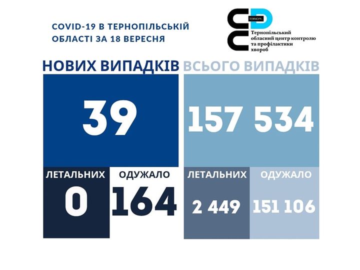 39 нових випадків коронавірусної хвороби COVID-19 зафіксовано в Тернопільській області за 18 вересня 2022 року. Про це повідомляє Державна установа «Тернопільський ОЦКПХ МОЗ України».