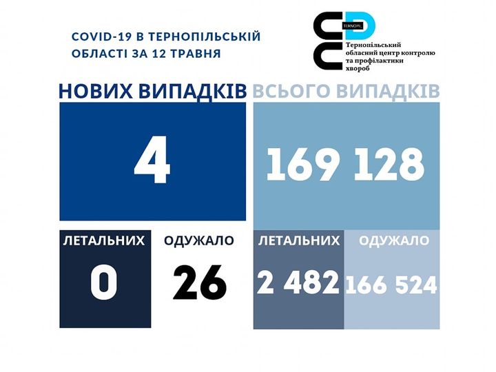 4 нових випадки коронавірусної хвороби COVID-19 зафіксовано в Тернопільській області за 12 травня 2023 року. Про це повідомляє Державна установа «Тернопільський ОЦКПХ МОЗ України».