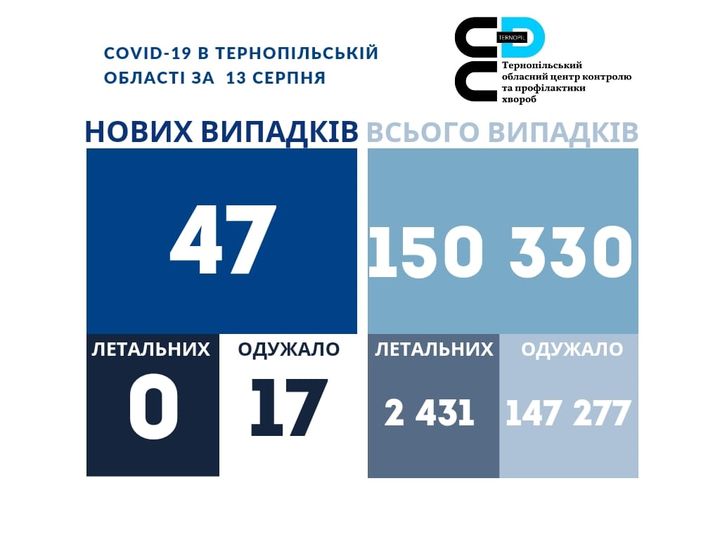 47 нових випадків коронавірусної хвороби COVID-19 зафіксовано в Тернопільській області за 13 серпня 2022 року. Про це повідомляє Державна установа «Тернопільський ОЦКПХ МОЗ України».