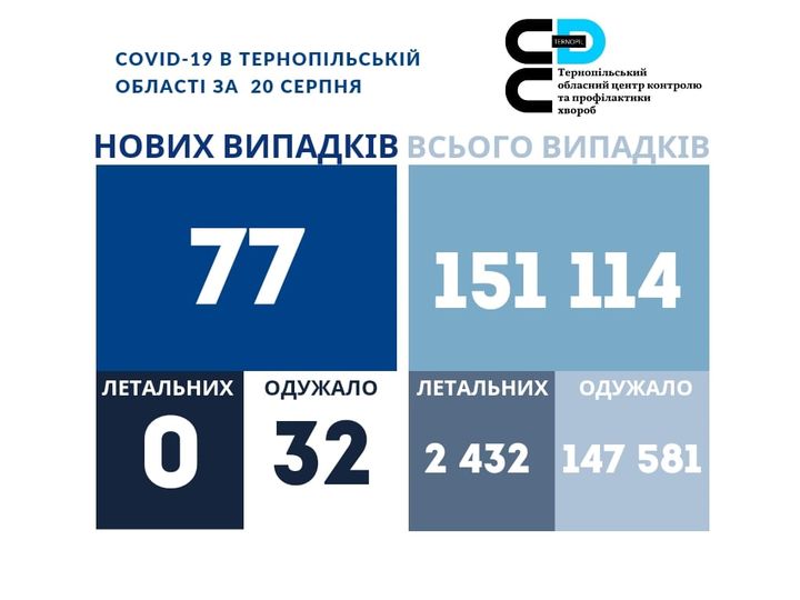 77 нових випадків коронавірусної хвороби COVID-19 зафіксовано в Тернопільській області за 20 серпня 2022 року. Про це повідомляє Державна установа «Тернопільський ОЦКПХ МОЗ України».