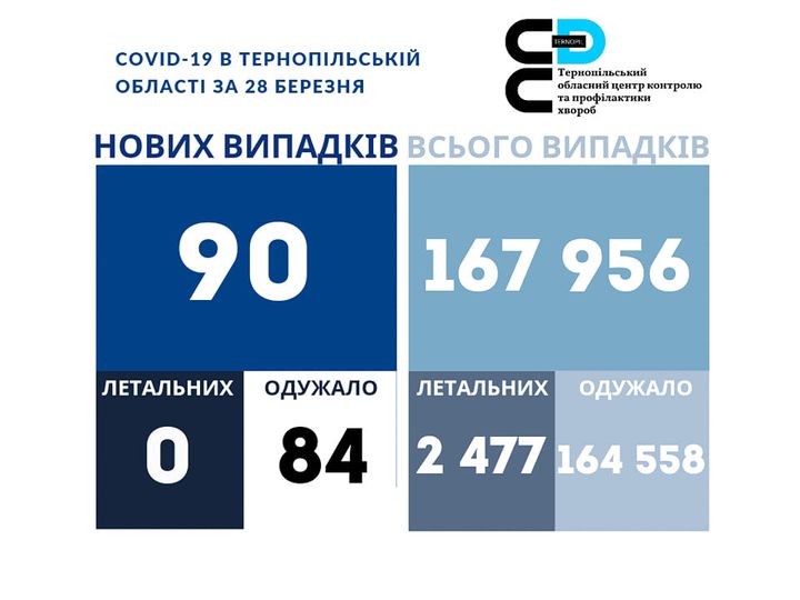 90 нових випадків коронавірусної хвороби COVID-19 зафіксовано в Тернопільській області за 28 березня 2023 року. Про це повідомляє Державна установа «Тернопільський ОЦКПХ МОЗ України».