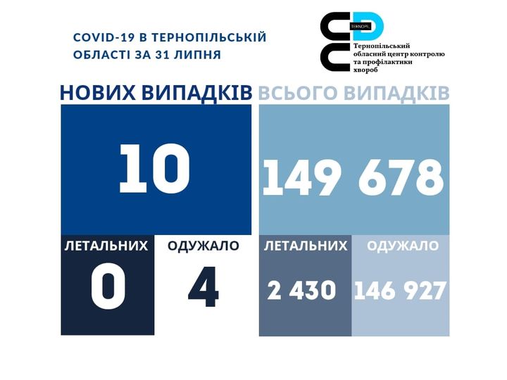 10 нових випадків коронавірусної хвороби COVID-19 зафіксовано в Тернопільській області за 31 липня 2022 року. Про це повідомляє Державна установа «Тернопільський ОЦКПХ МОЗ України».