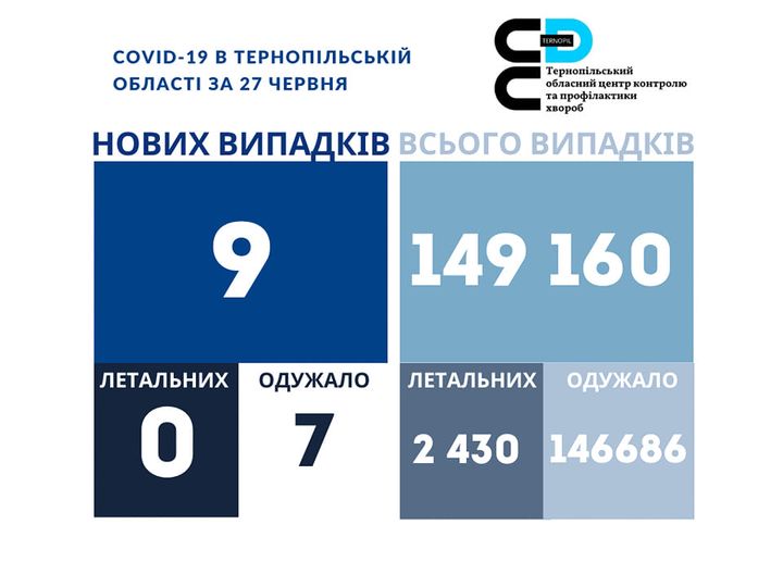 9 нових випадків коронавірусної хвороби COVID-19 зафіксовано в Тернопільській області за 27 червня 2022 року. Про це повідомляє Державна установа «Тернопільський ОЦКПХ МОЗ України»