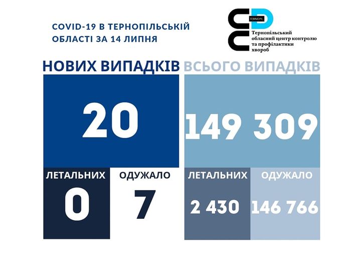 20 нових випадків коронавірусної хвороби COVID-19 зафіксовано в Тернопільській області за 14 липня 2022 року. Про це повідомляє Державна установа «Тернопільський ОЦКПХ МОЗ України»