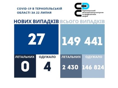 27 нових випадків коронавірусної хвороби COVID-19 зафіксовано в Тернопільській області за 22 липня 2022 року. Про це повідомляє Державна установа «Тернопільський ОЦКПХ МОЗ України».